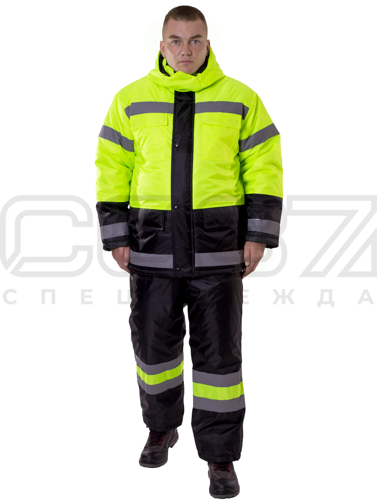 - Две параллельные световозвращающие полосы шириной 50 мм в нижней части брюк, с вставкой между ними полосы 50 мм лимонного цвета.
